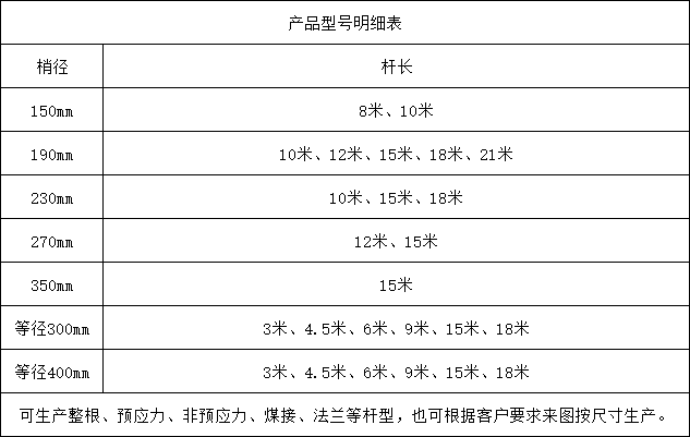 恒力通生產(chǎn)的電線桿有:8米電線桿(預應力)、9米電線桿(預應力)、10米電線桿(預應力)、12米電線桿(預應力)、15米電線桿(預應力)、18米電線桿(預應力)、10米電線桿(非預應力)、12米電線桿(非預應力)、15米電線桿(非預應力)以及18米電線桿(非預應力)等等不同規(guī)格以及類型的水泥電線桿。